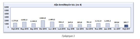 Η Αξία Συναλλαγών του Φεβρουαρίου 2017 έφτασε τα €825,67 εκατ. (βλ. γράφημα 1) σημειώνοντας μείωση κατά 1,5% από τη συναλλακτική δραστηριότητα του προηγούμενου μήνα που ήταν €838,59 εκατ. Σε σχέση με τον Φεβρουάριο του 2016 που η αξία συναλλαγών ήταν €1.275,63 εκατ., σημειώθηκε μείωση της τάξης του 35,3%.