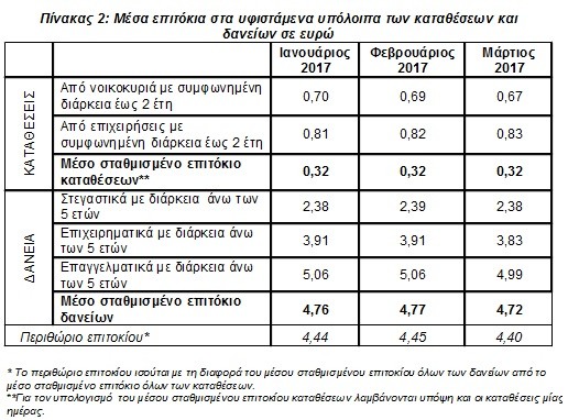 Αμετάβλητο στο 0,31% παρέμεινε, τον Μάρτιο του 2017, το μέσο σταθμισμένο επιτόκιο του συνόλου των νέων καταθέσεων, ενώ το μέσο σταθμισμένο επιτόκιο των νέων δανείων μειώθηκε κατά 6 μονάδες βάσης στο 4,47%.